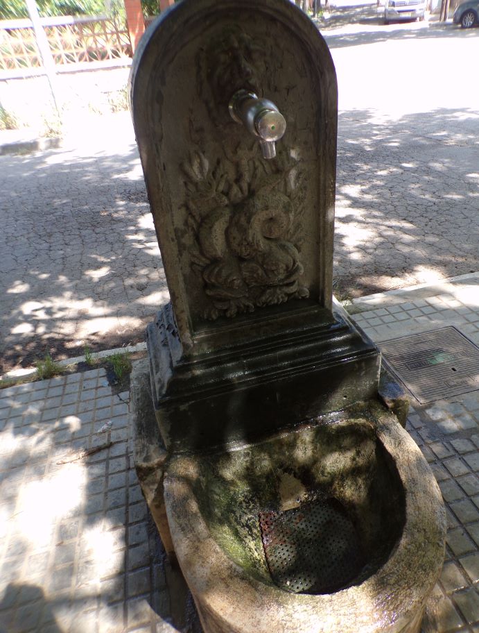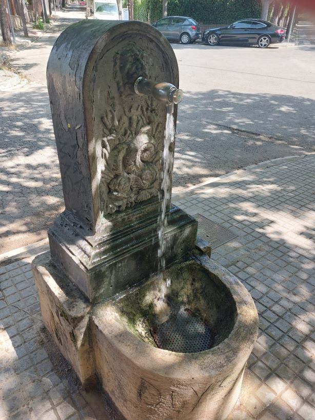 D’una cara hi ha actualment una aixeta polsador, l’aigua cau a una pica rodona.