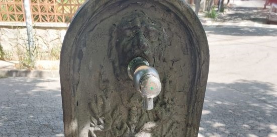 D’una cara hi ha actualment una aixeta polsador, l’aigua cau a una pica rodona.