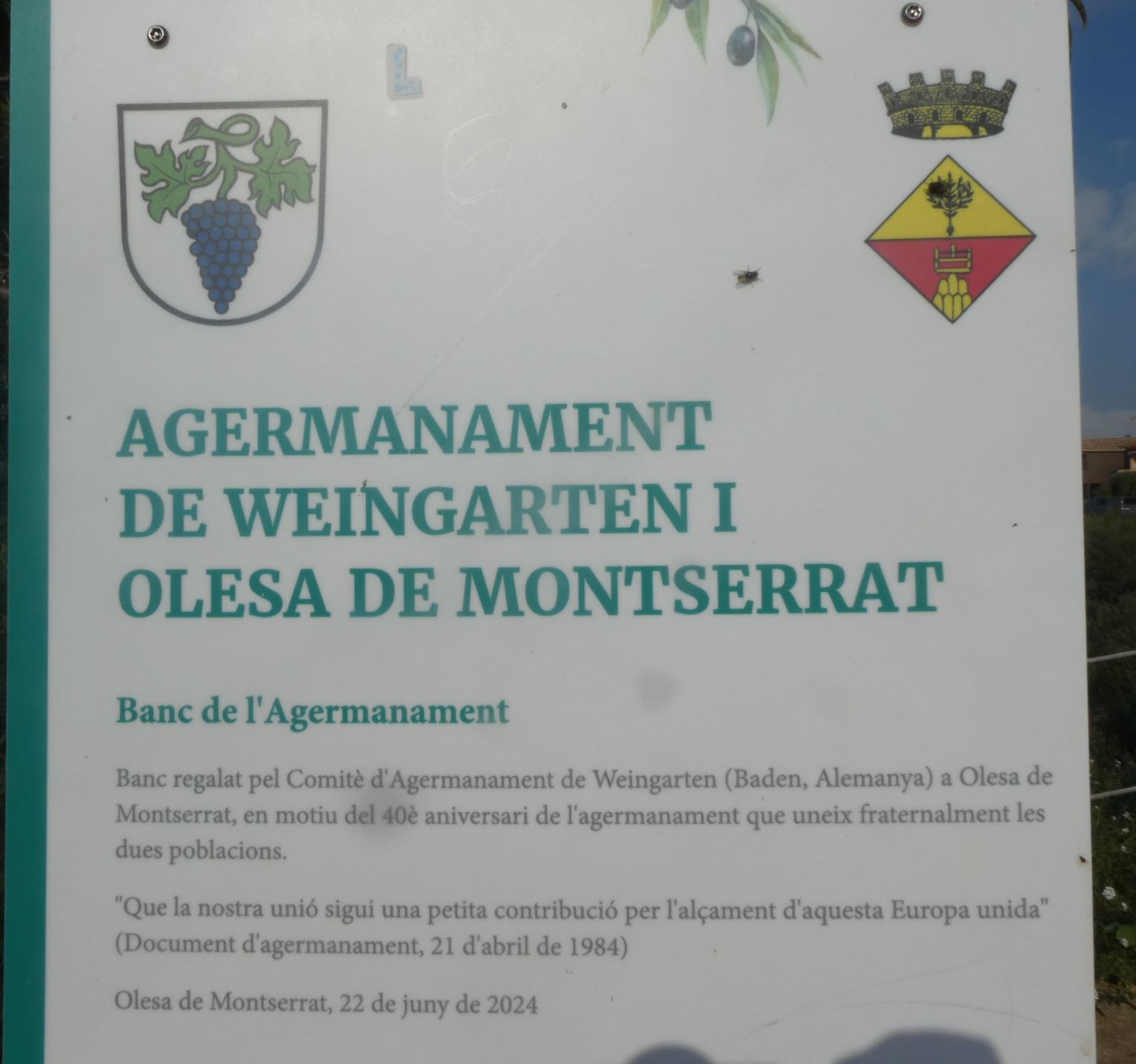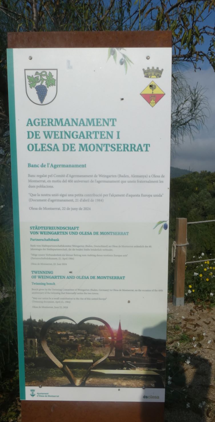 Aquest Banc va ser regalat pel Comitè d’Agermanament de Weingarten (Baden d’Alemanya) a Olesa de Montserrat.
