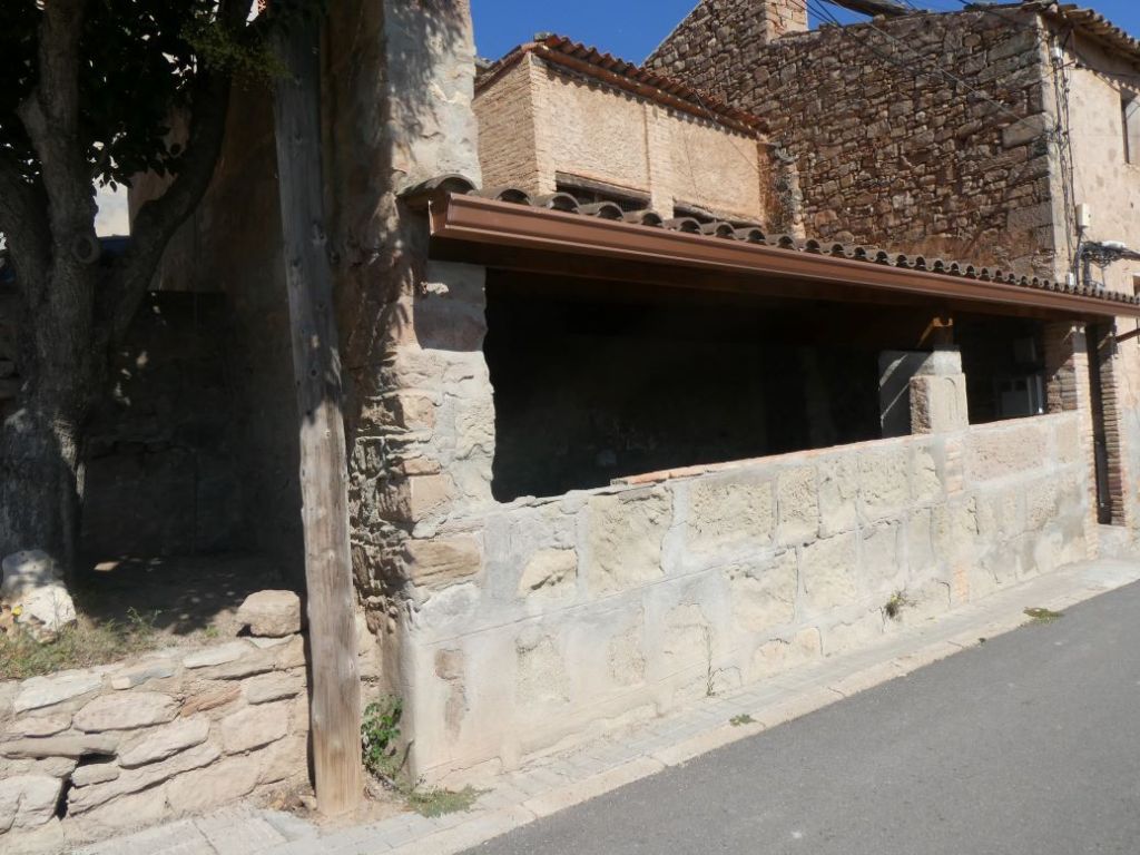 Per tal de deixar dues grans obertures, la coberta se sustenta sobre amb un pilar central de pedra i el marc de la porta de maó. El pilar central de la façana té la següent inscripció: “AÑO / 1921 / 1867 / 1781”, que podem associar a diversos moments constructius de l’equipament.