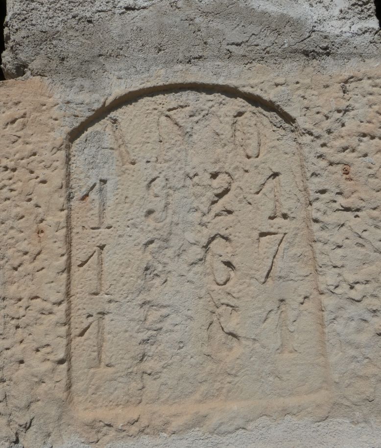 Per tal de deixar dues grans obertures, la coberta se sustenta sobre amb un pilar central de pedra i el marc de la porta de maó. El pilar central de la façana té la següent inscripció: “AÑO / 1921 / 1867 / 1781”, que podem associar a diversos moments constructius de l’equipament.