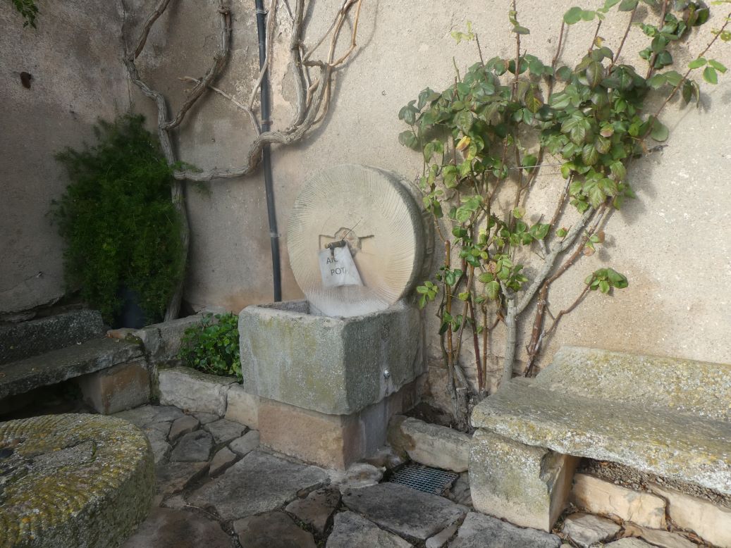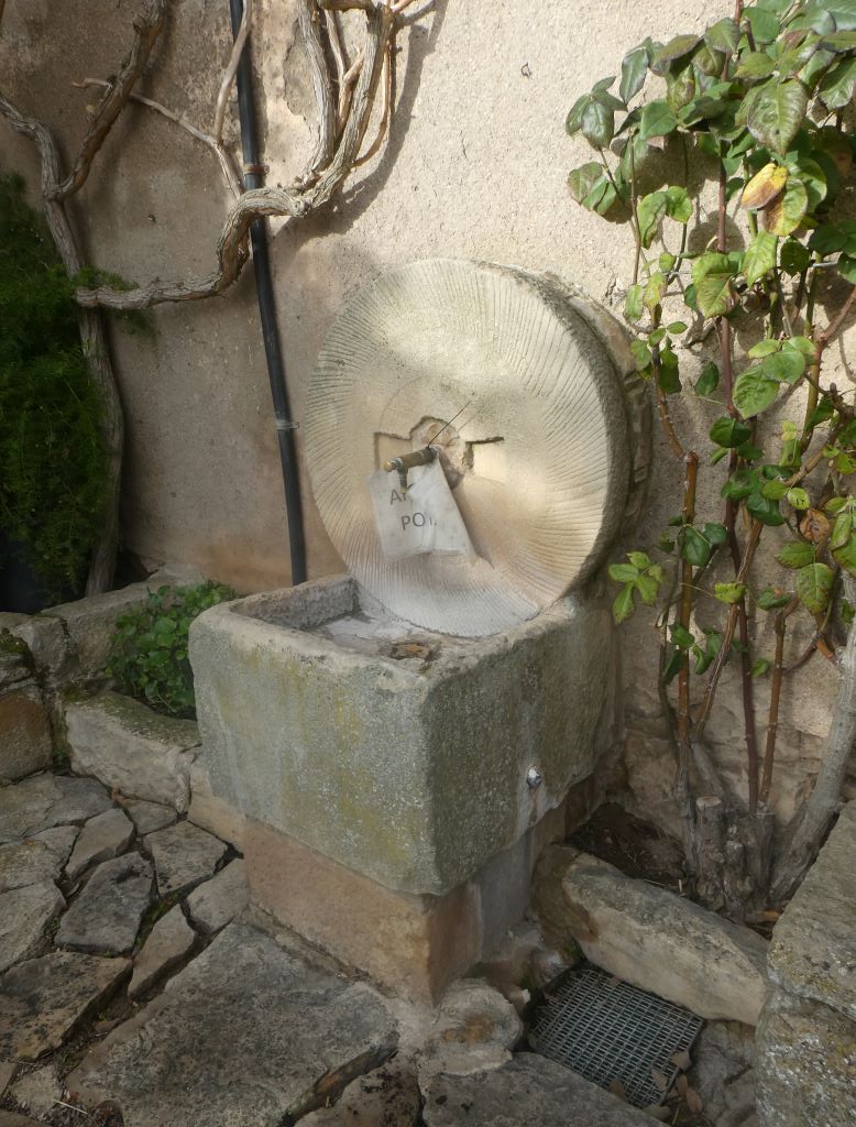D’una roda de moldre, i en el seu centre hi ha una aixeta polsador, l’aigua cau a una pica elevada del terra.