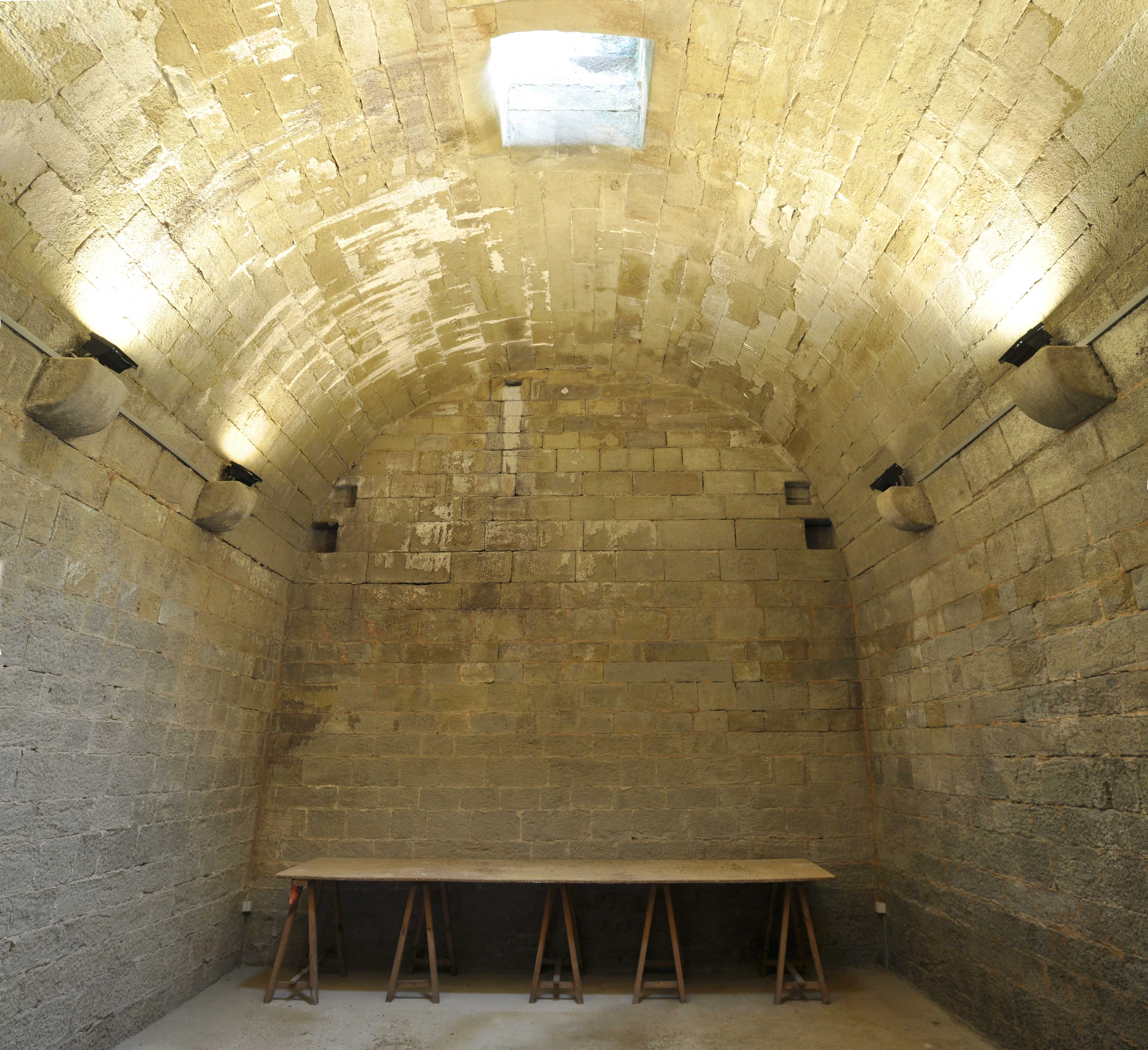 La construcció és rectangular excavada a la roca per sota del nivell del carrer, realitzada amb volta de canó mitjançant carreus regulars de mitjanes dimensions rejuntats amb morter d’arena i calç. Situades a les parets laterals, just a l’arrencada de la volta, hi trobem tres mènsules que es podien utilitzar per sostindré una sèrie de bigues amb una finalitat actualment desconeguda.