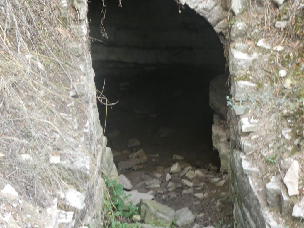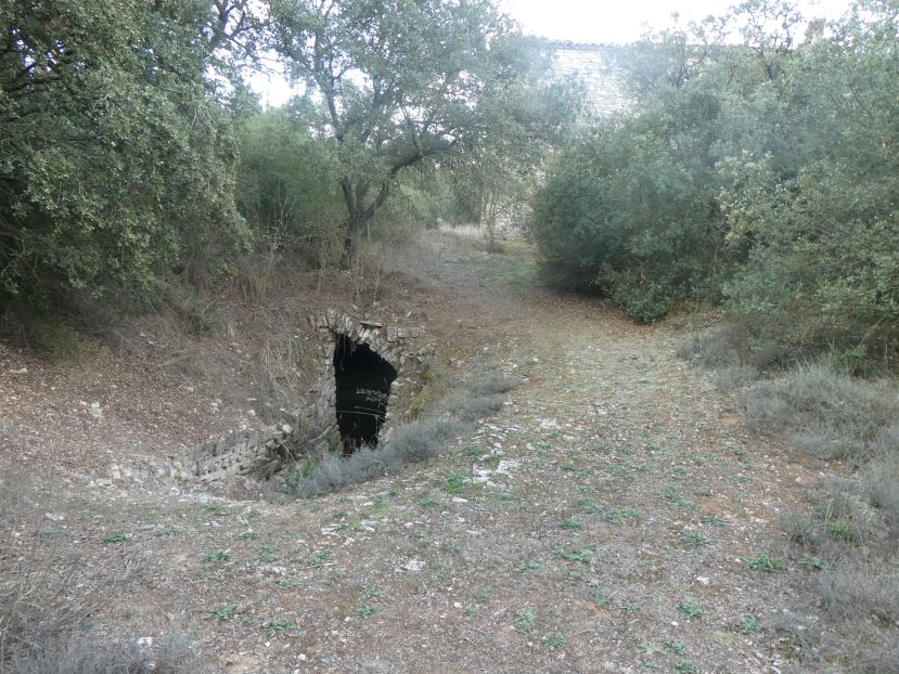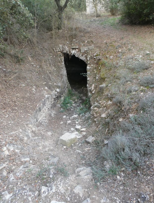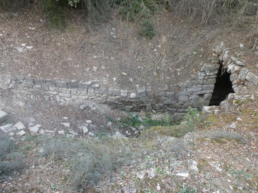 Per poder accedir a l’interior de la font, va fer falta obrir una rasa, quedant delimitat aquest espai d’accés a partir de dos murs laterals obrats en pedra seca que el terreny.