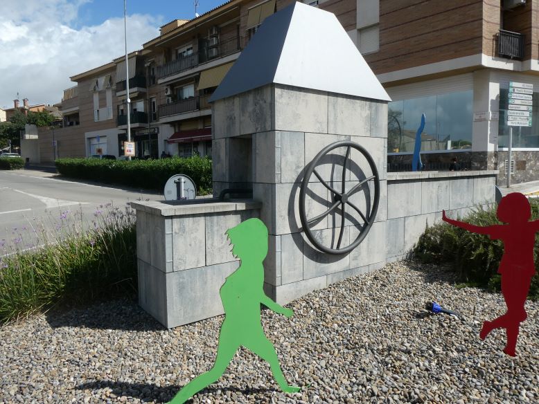 L’escultura és una reproducció de la bomba amb diverses representacions de nens jugant i dones rentant, en planxes metàl·liques de colors.