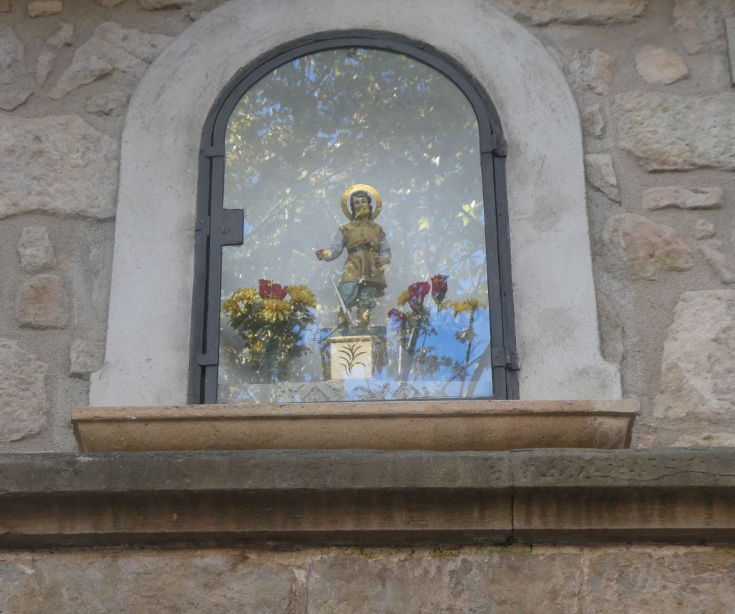 A sobre de la estructura i en mig de dues finestres hi ha una imatge de Sant Isidre dins d’una capella.