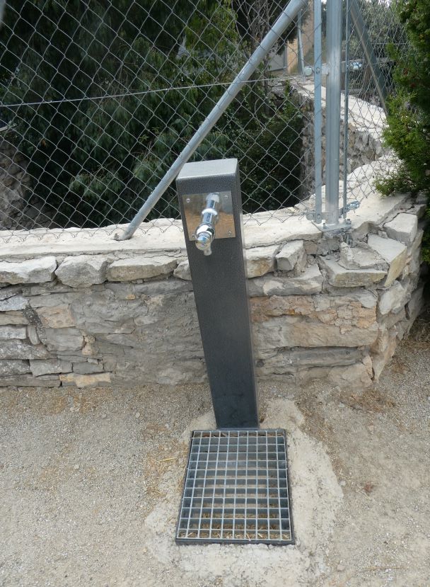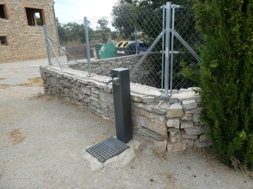 La pica de desguàs i l’aixeta, de polsador i cromada, estan posades en un podi de planta rectangular fet de pedra, damunt el qual s’aixeca una creu de pedra, flanquejada per dues esferes granítiques.