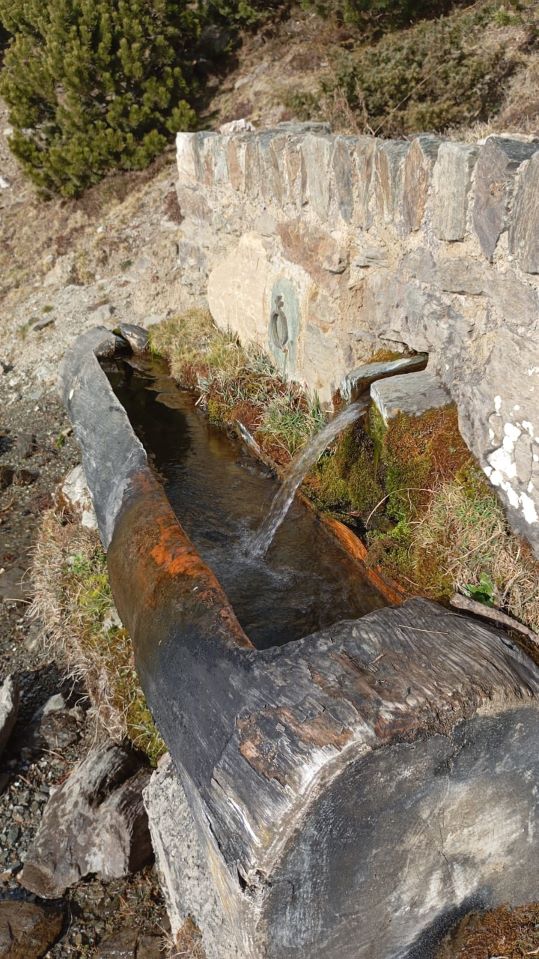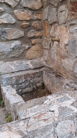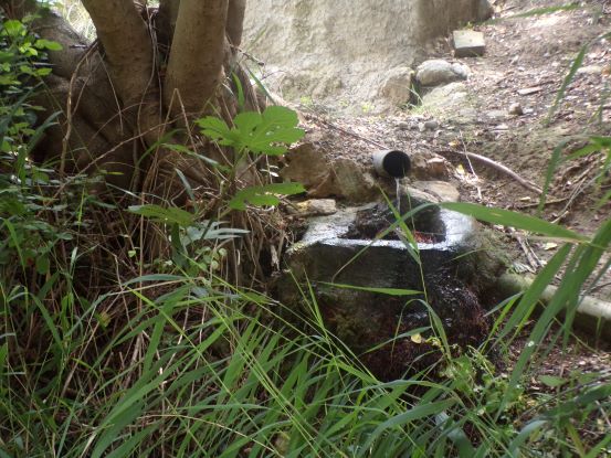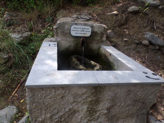 d’on raja l’aigua que es recull en un canal, fet amb pedra saulonenca, que la porta fins al safareig, una construcció rectangular de pedra on s’hi accedeix mitjançanat unes escales,