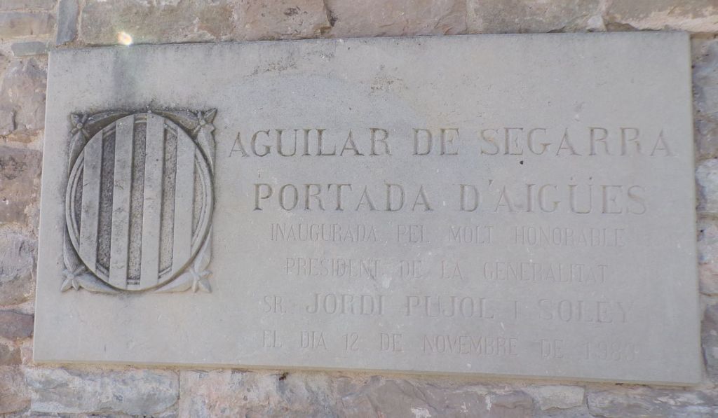 En aquest mur hi ha una placa commemorativa de la inauguració de la font en què es llegeix “Aguilar de Segarra portada d’aigües. Inauguració pel molt honorable president de la Generalitat de Catalunya Jordi Pujol i Soley, el dia 12 de novembre de 1983”.