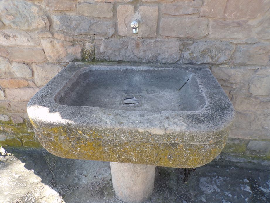 La font d’aixeta polsador, està formada per una pila de pedra rectangular, aguantada per un pilar circular.