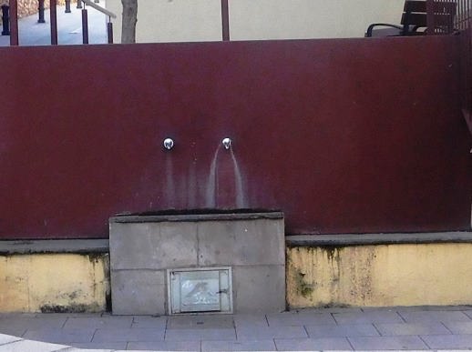 En la ma dreta de la Font – Abeurador, hi ha dues aixetes de polsador, una a sobre de l’altre.