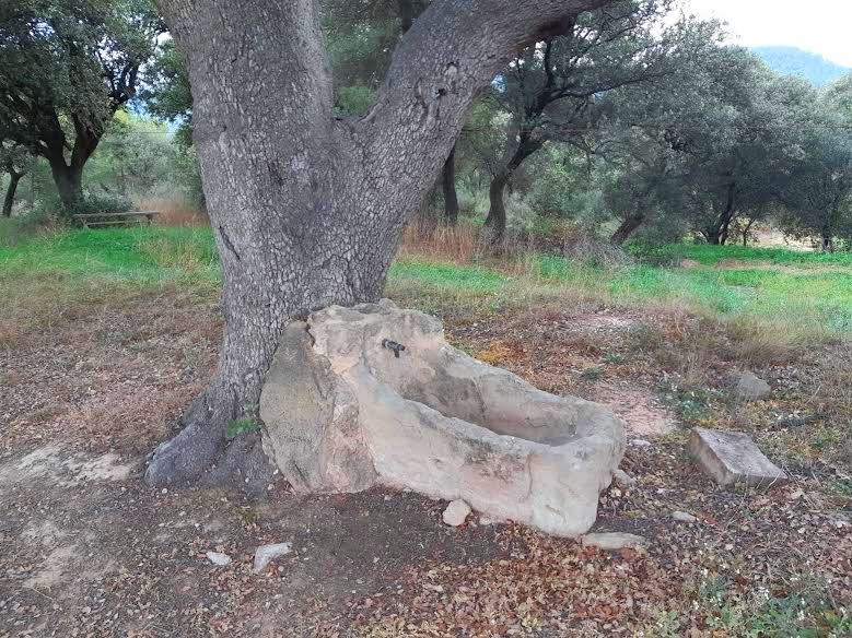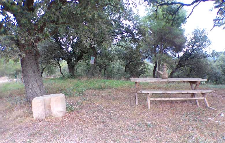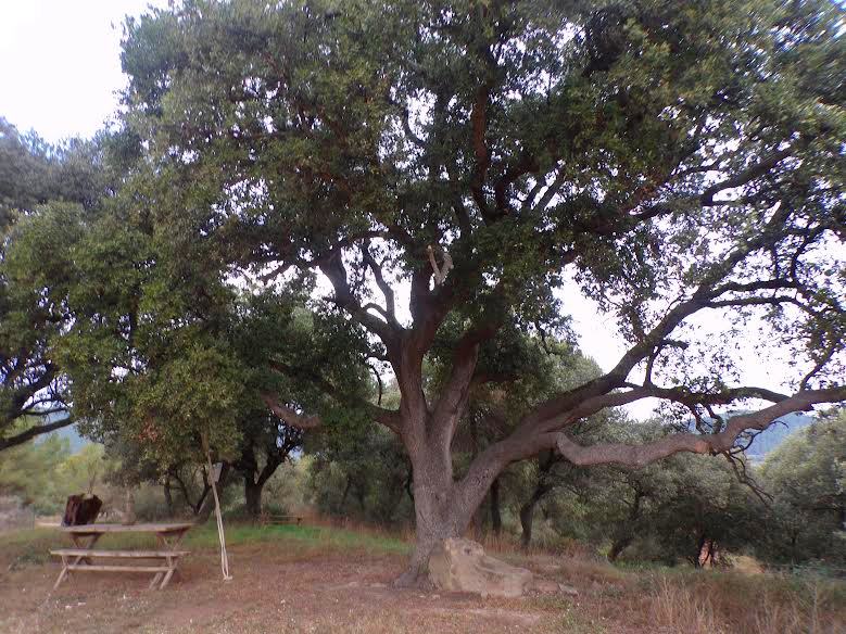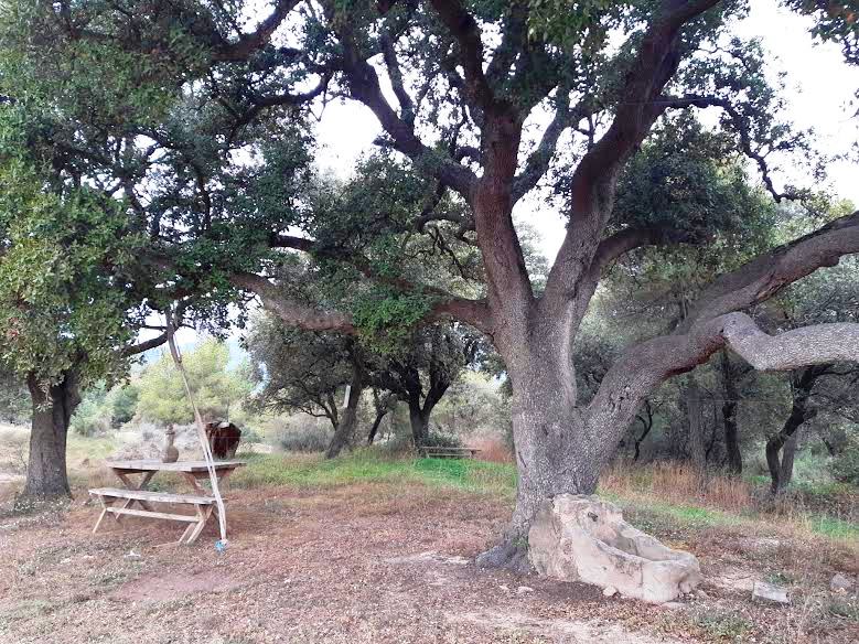 en una zona que s’ha habilitat amb taules i bancs de pedra, sota un petit alzinar.