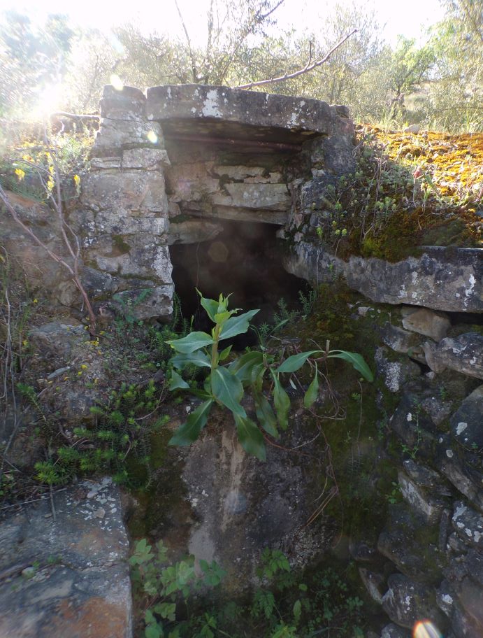 Dipòsit pel magatzematge d’aigua retallat parcialment a la roca, i encabit en un marge de pedra seca, a peu de camí, per sota del Pi rodó, que du directament al mig d’unes feixes plantades d’ametllers i oliveres. La coberta és de lloses per aproximació de filades, amb una gran llosa de tancament al damunt.