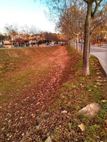 Una riera en lloc d’aigua, esta plena de fulles a la tardor, és a Llinars del Vallès.