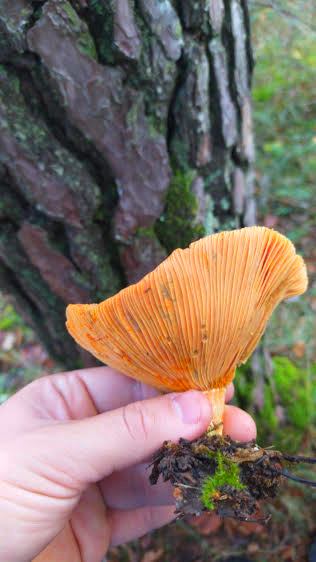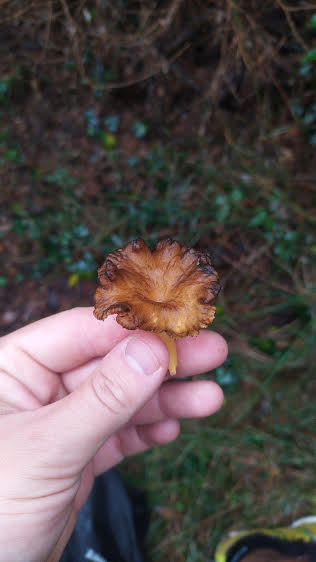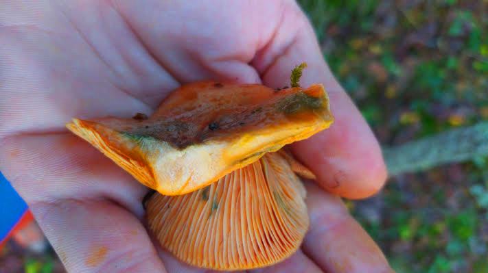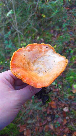 La cara inferior, que és d’un bell color taronja suau, primer llisa i després venada, sense làmines definides, s’uneix sense solució de continuïtat amb la cama, afuada i del mateix color.