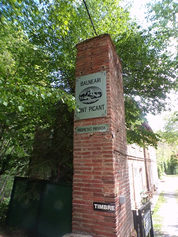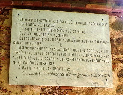 m’entres mireu la placa que hi ha a la paret de l’edifici de la masoveria i que fa referencia a les aigües mineromedicinals.