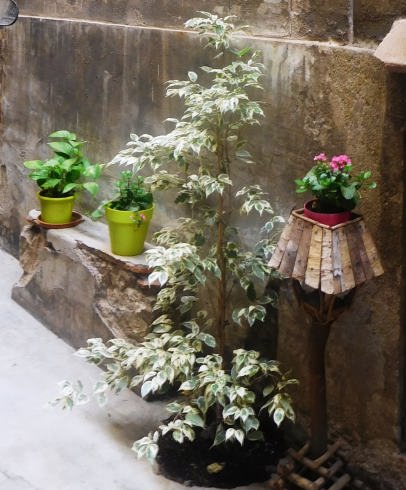 entre ells, unes taules amb testos i plantes, algunes amb flors, objectes de decoració, flors de plàstic, alguna cadira.