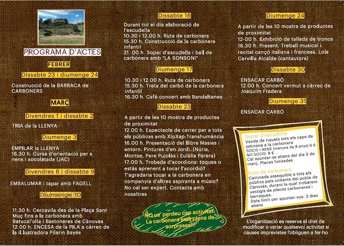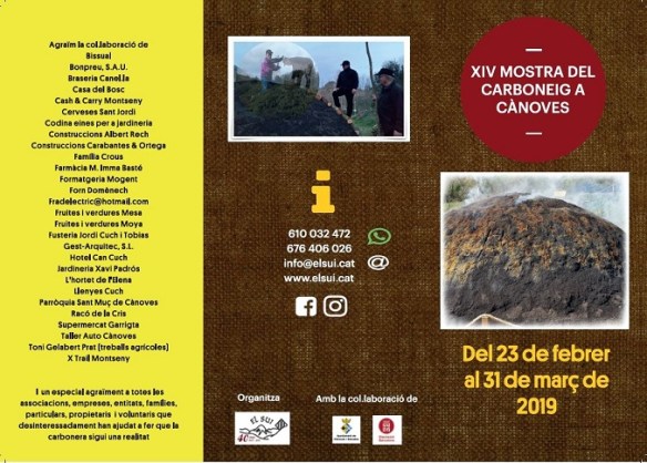 Del 23/02/2019 al 31/03/2019, és reviu com era l’ofici de carboner a la Mostra de Carboneig de Cànoves i Samalús, està situada sota el camp de la Rectoria.
