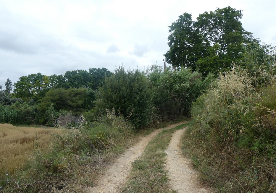 un camí a la dreta que fa una certa baixada pel mig de camps conreats.