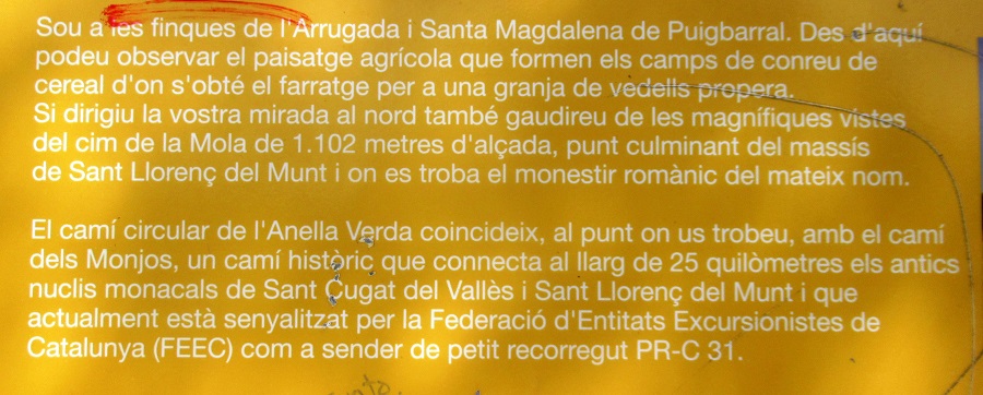 Es passa per la Finca de Santa Magdalena de Puigbarral, d’allí a l’Àrea d’estada de l’Arrugada, en aquest punt tornar a Terrassa …