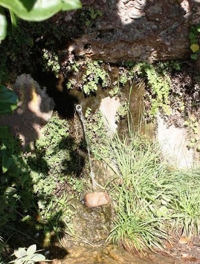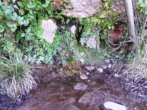 A mà esquerra, en el mateix estrat, la nova surgència amb un orifici situat a una trentena de centímetres del terra i un tap amb una cadeneta. A mà esquerra mig esborrades pel degotall de l’aigua hi ha les quatre barreres pintades de color groc i vermell. L’aigua que es filtra a través de la mateixa paret s’escola pel camí, travessant-lo i acumulant-se en una basseta natural envoltada de lleteroles florides i arítjol, fàcil d’identificar per la presència de joncs al seu interior.