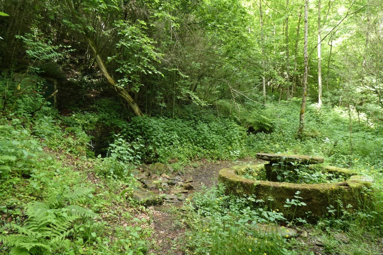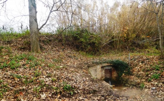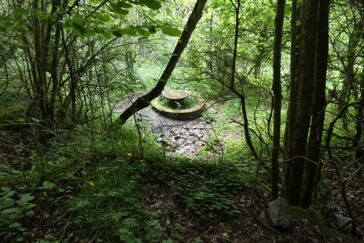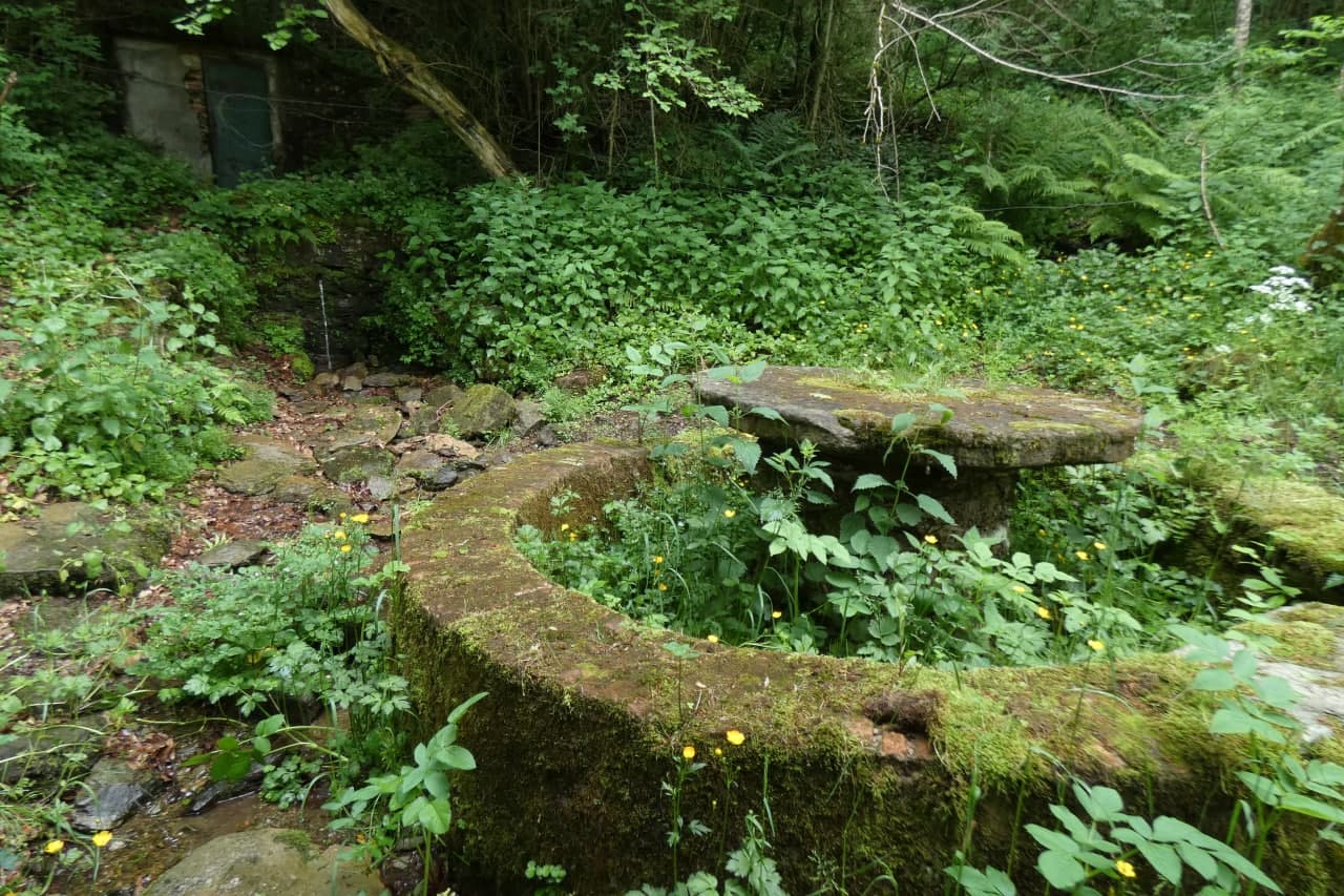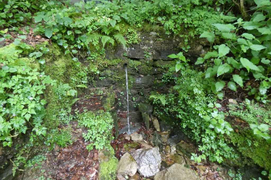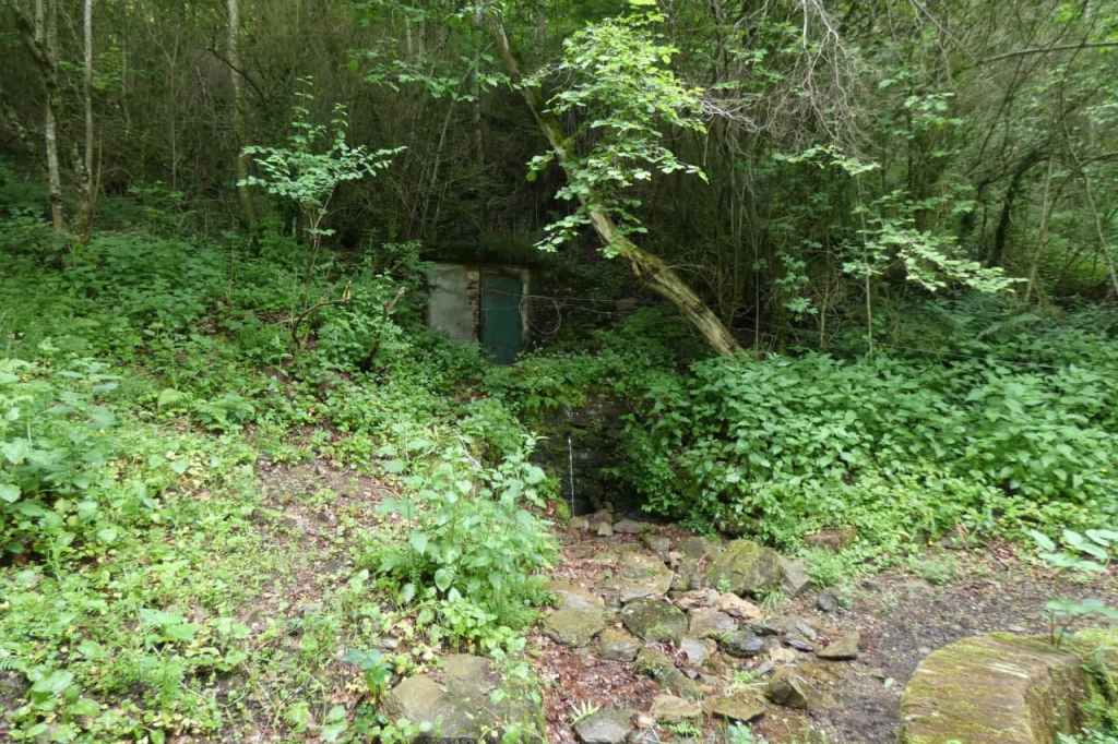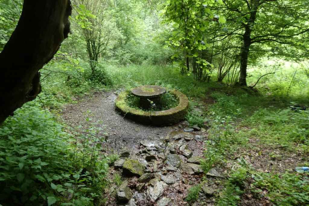 trobarem una taula i seient de pedra, si aixeca al seu costat una caseta en que s’indica que es tracta d’un punt de captació d’aigua de consum humà,