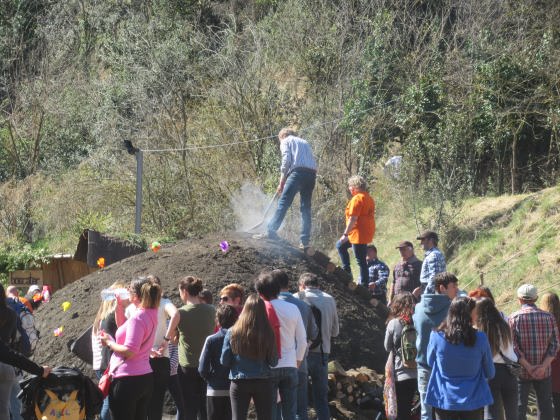 A partir de l’encesa, els participants, tots ells coneixedors de l’antic ofici de carboner, que conviuen i es reuneixen al voltant de la tradicional barraca, alimentaran dia i nit la pila perquè no s’apagui ni deixi de fumejar. A final d’octubre es procedirà a rescaldejar i desempilar el carbó vegetal.