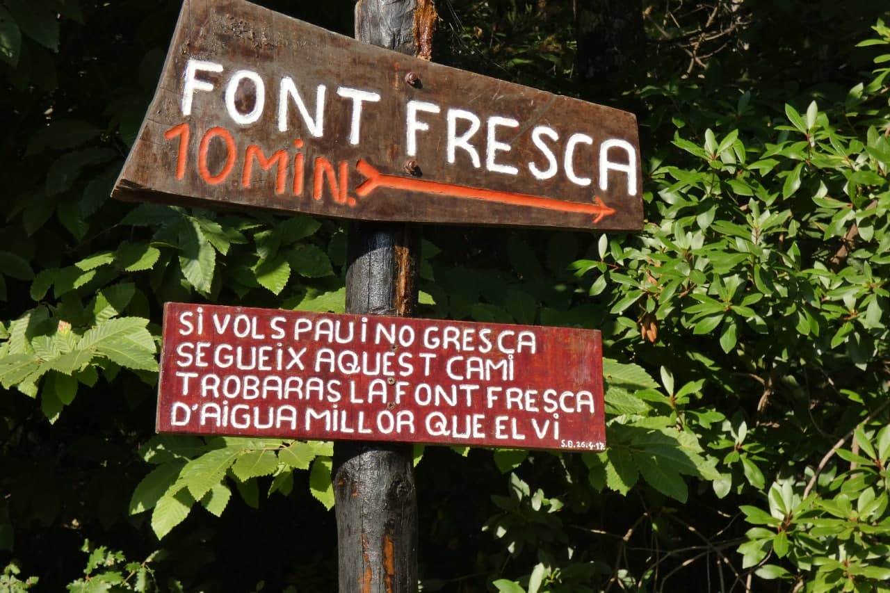 Al poc creueu un torrent per un petit pont de fusta i una mica més amunt travesseu un gual del mateix torrent, estareu en la Font Fresca.