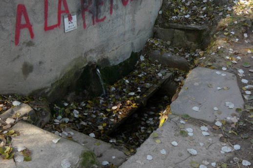 L’aigua surt amb abundància a l’exterior per un gruixut tub, cau i s’escola per un enreixat de ferro i va a una gran i antiga pica i d’aquí per una canonada al riu.