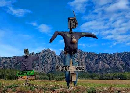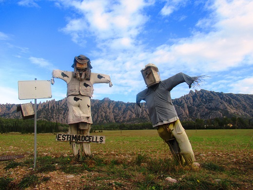 Entremig de les figures de roba i palla trobem caixes-niu, per tant no es per atemorir o asustar els ocells, tot el contrari, que tinguin un lloc on fer el niu, en un espai on no hi ha arbres a un costat d’un camp.