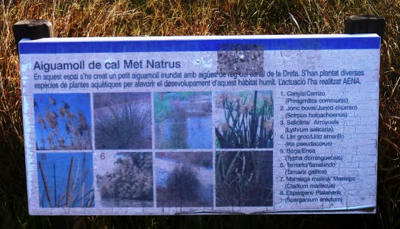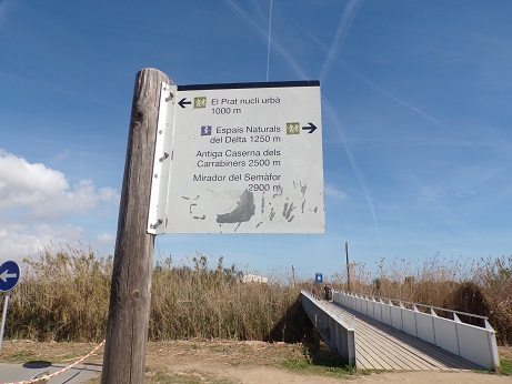 Un cartell ens indica per anar a Delta del Llobregat, Mirador del Semàfor, Antiga caserna del Carrabiners…