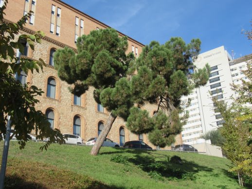 Aquest Pi és singular per la seva forma de com s’ha desarrollat,està situat entre el pont de l’Avinguda de Jacquard i la part de darrera de l’Hospital de Sant Llàtzer, a tocar en una zona enjardinada als límits en aquest lloc amb el Parc.Es veu mes perquè esta solitari en aquesta zona.És un Pi pinyer, que segurament a l’estar en una important inclinació del terreny, les branques s’han dirigit unes cap a vaig i les altres en sentit contrari, per equilibrar el pes i estar així subjecta millor al terreny,també, podria ser que simplement és una curiositat en la formació d’aquest Pi singular…