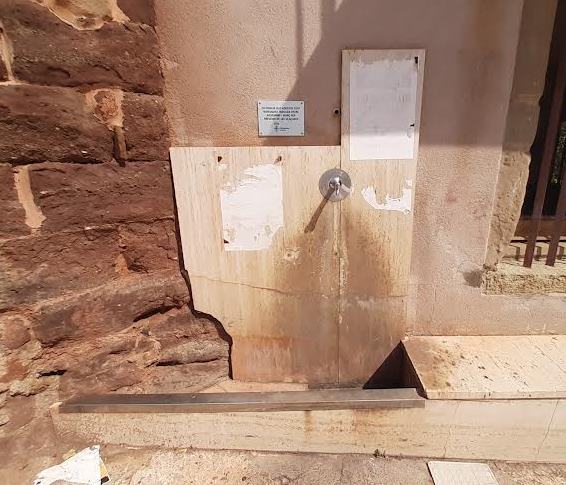 Esta arreglada amb rajoles modernes, al centre te l’aixeta polsador i l’aigua de xarxa pública cau a dins d’una pica rectangular no massa gran.
