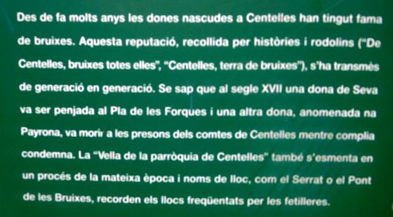 Aquesta reputació, recollida per històries i rodolins com a “De Centelles, bruixes totes elles”, “Centelles, terra de bruixes”, s’ha transmès de generació en generació… per tot axó es diu de Centelles “Terra de Bruixes”.