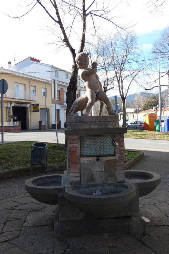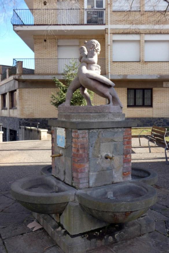 La paret fa un arc sobre la font i a cada banda hi ha una pedra gran que fa de banc.