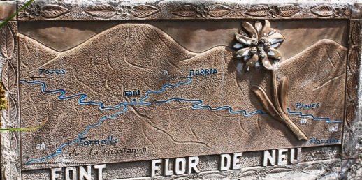 Fa poc temps tenia un bonic mosaic en relleu amb un mapa amb la ubicació de la font, els principals pobles propers i un perfil de les muntanyes i una Flor de Neu que li dóna el nom, però com passa… moltes vegades ja no hi es aquest bonic cartell…!