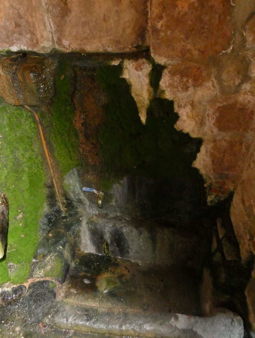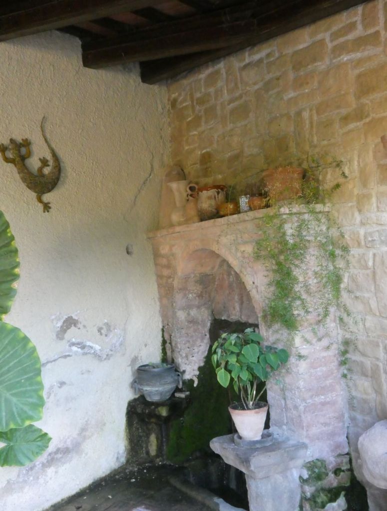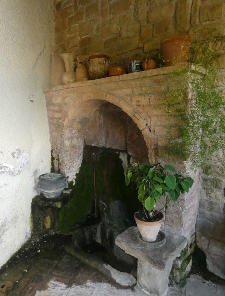 Una aixeta de maneta o palanca moderna, dona pas a l’aigua que cau a una pica rectangular a nivell del terra, on desaigua. Està decorada amb plantes i objectes de terrissa.