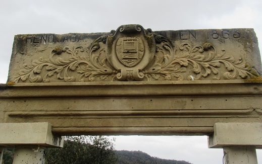 En destaca especialment un antic fris de pedra amb relleus, col·locat sobre unes columnes de formigó.