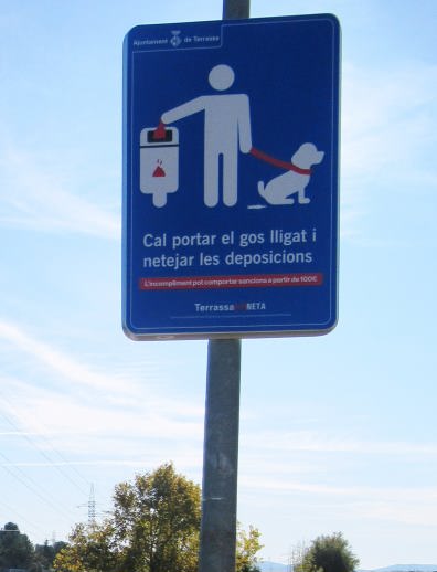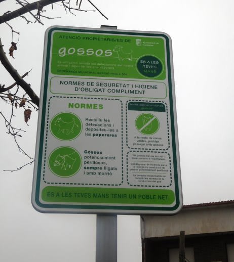 Els cartells que trobem en les ciutats i pobles, aconsellant i /o prohibeixen amb normes establertes, amb possibilitat de sanció,i no van dirigits els gossos, ells no saben llegir, van dirigits als amos d’aquests…Està clar que no hi ha una unificació del tipus de cartell, cada ciutat o poble, disposa de les seves ordenances al respecta, que en casi tots el casos son similars,però expressant-ho i redactant-ho cada municipi ho fa a la seva manera segons criteri de la regidoria.Us passo diferents cartells d’arreu de municipis de Catalunya, a dins del cas urbà :