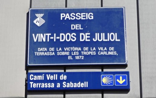 Per aquest motiu, l’Ajuntament de Terrassa no fa massa va col·locar senyalització característica de la ruta xacobea per l’itinerari que discorre dins la trama urbana i que es fruit dels dos camins de Sant Jaume que coincideixen a Terrassa: el provinent de la frontera francesa, i que ve de Sabadell,