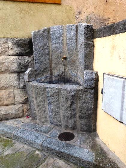 Està construïda de pedra vista i acabat superficial de relleu, adossada al marge, amb el frontal endarrerit respecte la façana mitjançant un arc de volta que centra la posició de la font.