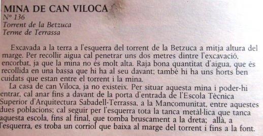 En el llibre de “ Fonts i Mines del Rodal de Sabadell “autor Ricard Molins i Romeu, podem llegir de la Font – Mina de can Viloca: