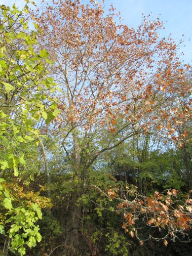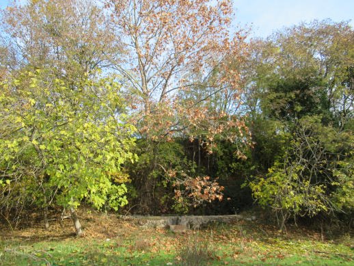 un gran plataner i una bassa, allí esta situada la Font – Mina de can Viloca.