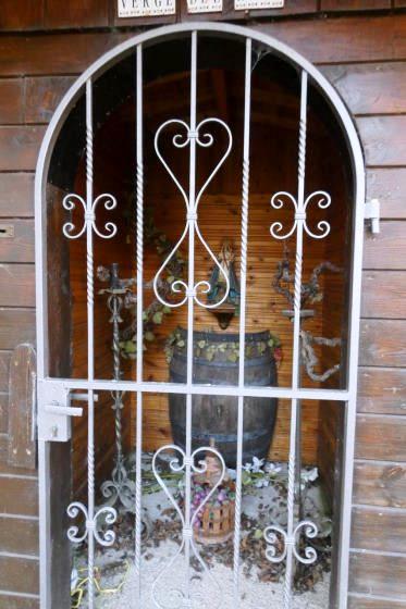 En un costat, veureu un oratori com si fora una caseta i és de fusta, amb la Mare de Déu del Raïm a dins seu, tancada i protegida per una reixa.