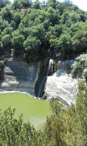 En cada costat de la Font disposeu de dos bancs de pedra per seure. Al fons circula la riera de les Gorgues.