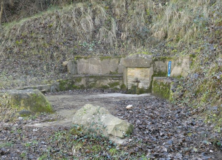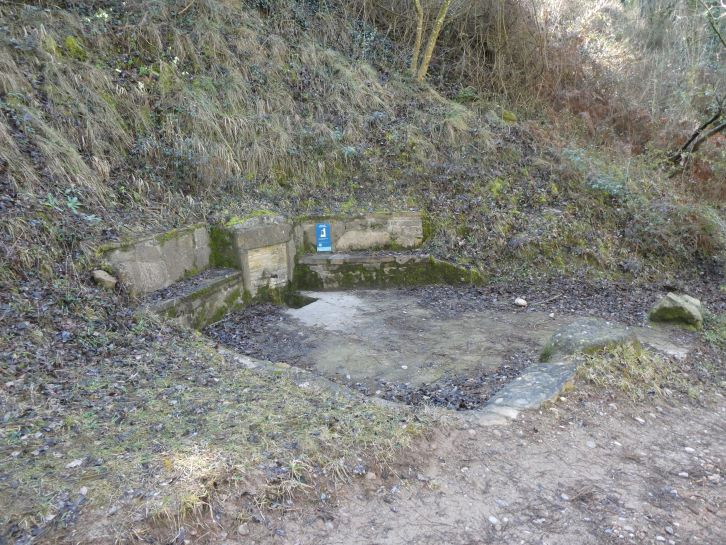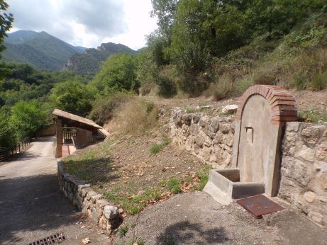 Al costat del safareig, hi ha una font; aquesta compta amb un frontal de constitució senzilla fet a partir de maó massís i formigó al centre del qual hi ha l’aixeta polsador de llautó;