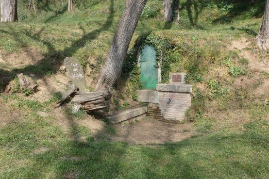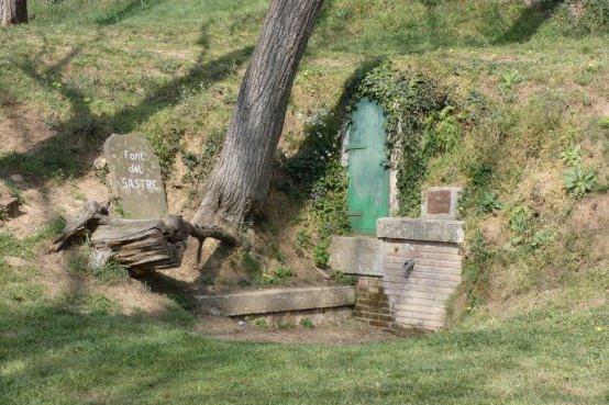 la font presenta un petit túnel tancat amb una reixa on es troba la mina.