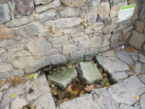 L’aigua, no potable, surt per un canaló a una cubeta de petites dimensions des d’on desguassa per una canonada per sota del camí d’accés.