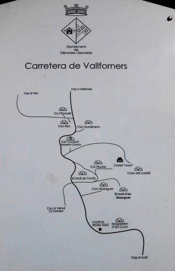 Sortirem des de l’Església, i al poc agafarem un camí indicat per uns cartells, del passeig fluvial d’Antoni Crous, que davallarà fins la riera de Vallfornes o de Cànoves, el creuem per una passera.