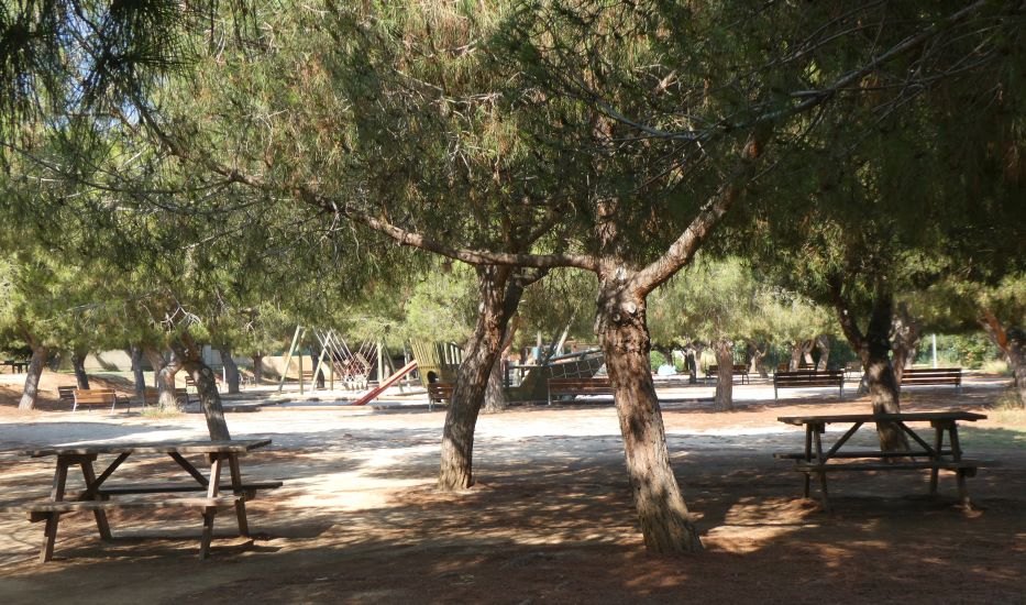 disposa d’una àrea de pícnic amb taules i cadires, a la ombra dels arbres,